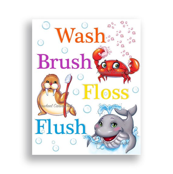 Kids Bathroom Wall Decor Wash Brush Floss Flush Sign Kids Etsy
