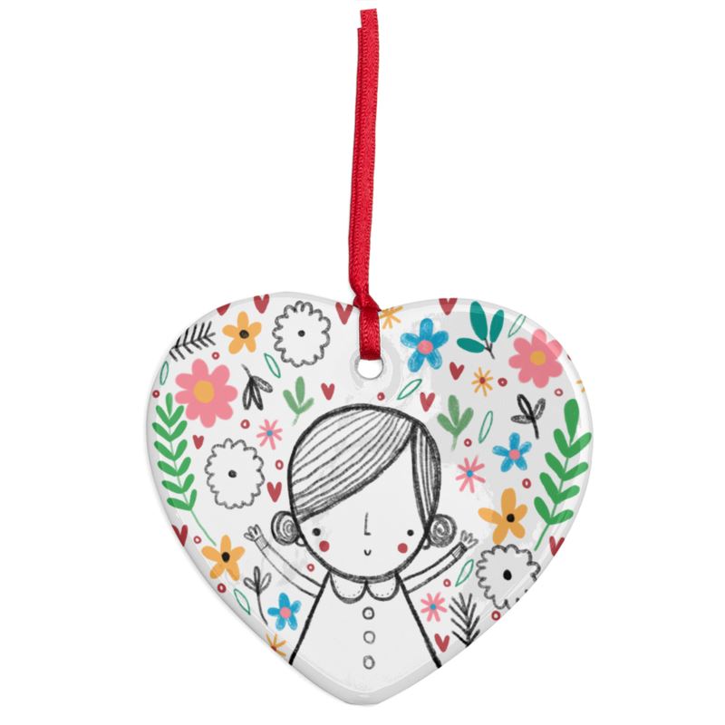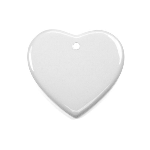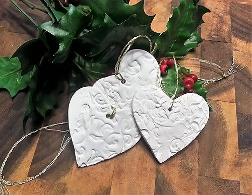 Handmade ceramic hanging white heart ornament with lace flower design.