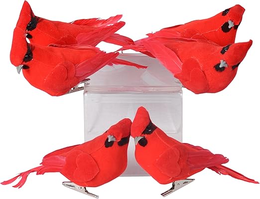 Set Of 6 Red Cardinal Birds Christmas Ornaments With Clips