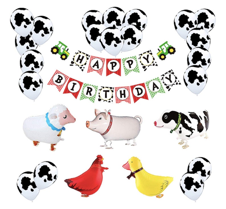 Cow pig horse sheep barn tractor and farm party invitations and supplies.