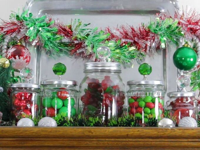 Fill six like sized canning jars with ornaments tinsel greenery you name it.